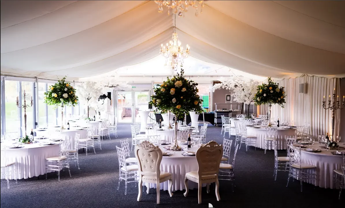 The century pavilion is fully dressed to a high standard including modern crystal chairs, starlit dancefloor, LED lighting, stunning centre pieces and full size indoor blossom trees. we stage regular open days for you to come and view the pavilion fully dressed which will without doubt give you ideas and inspiration for your big day!